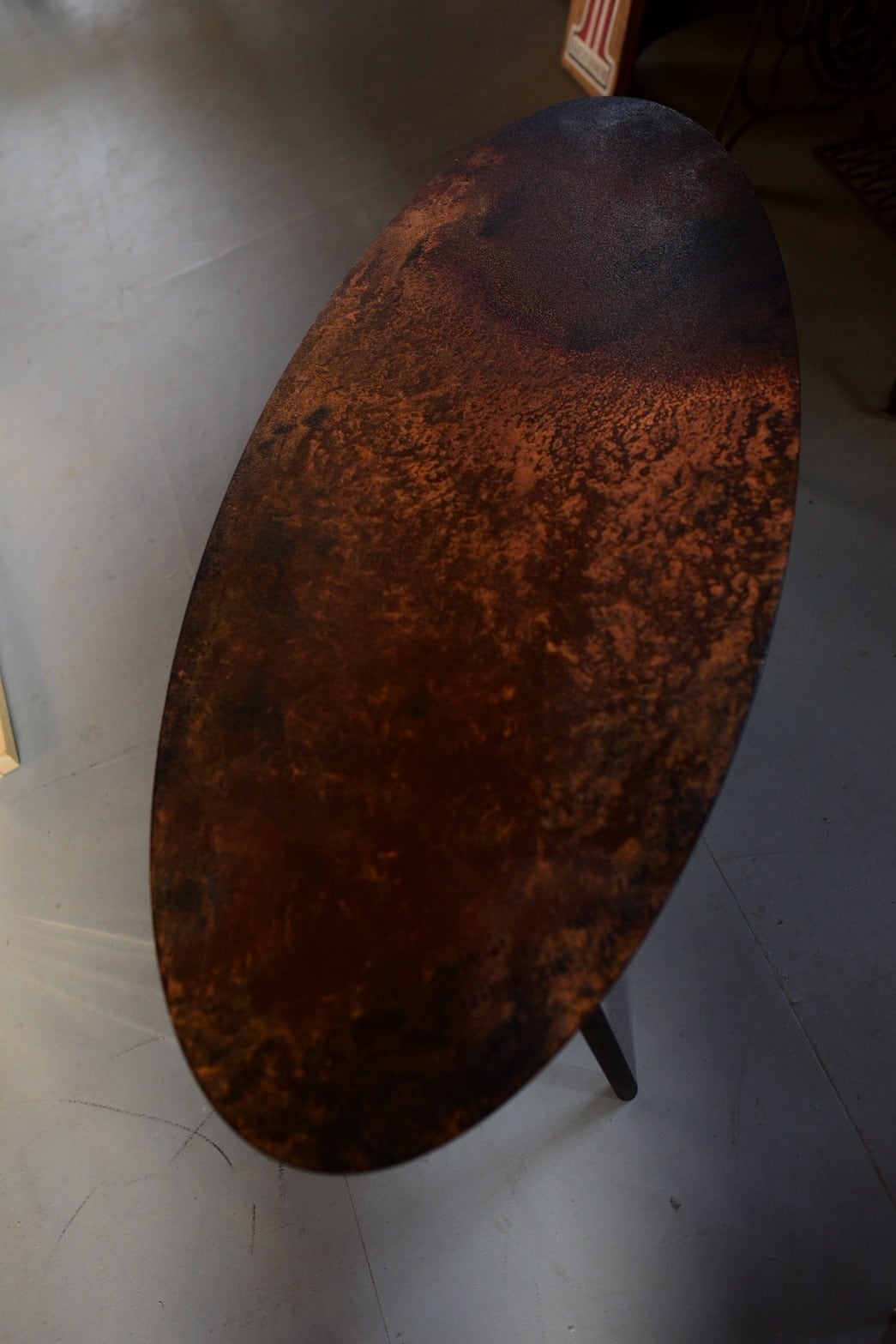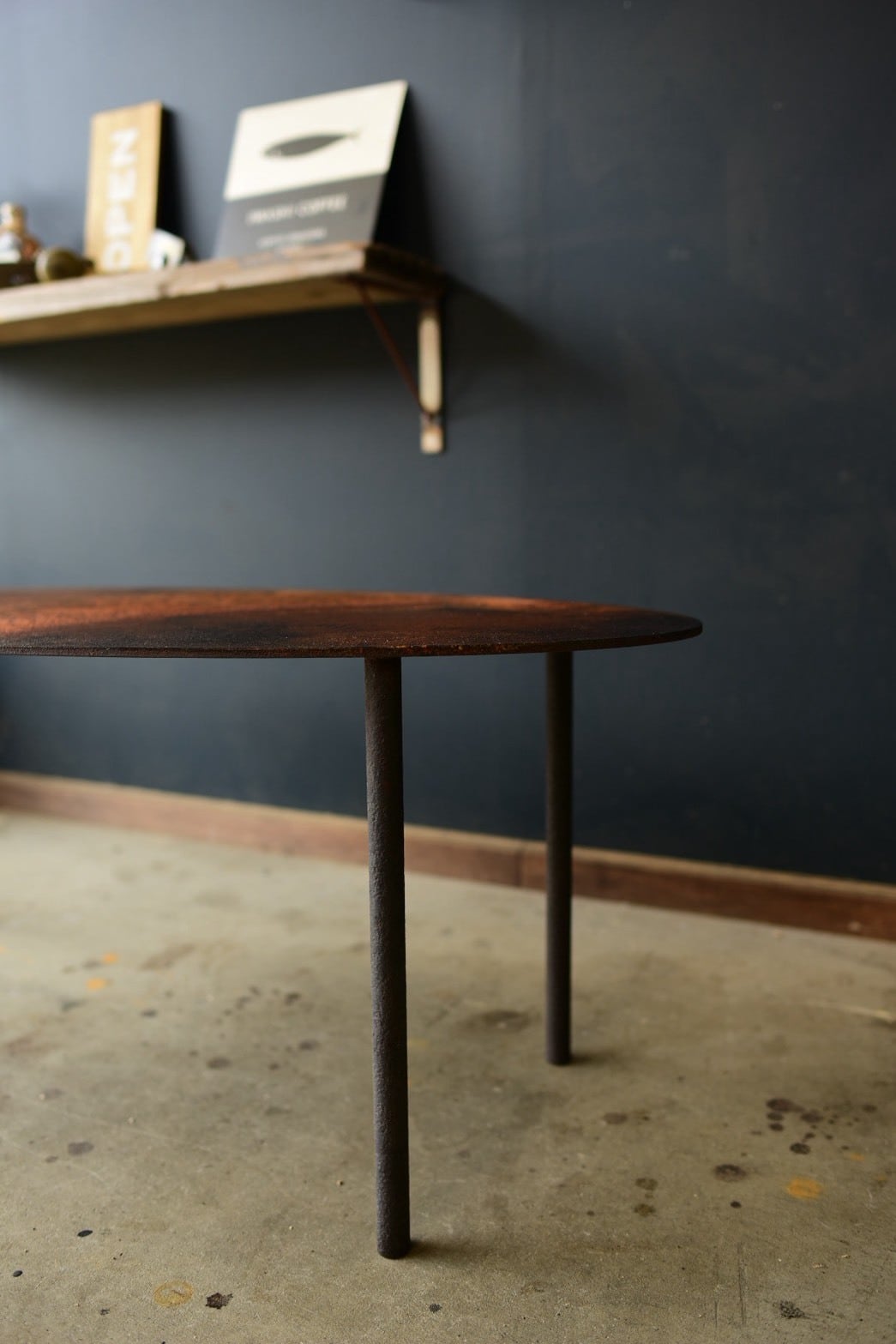 趣味のガレージに鉄の錆テーブルを置きたいというご相談から始まったプロダクト。直線的なものが多い空間に、楕円でリズムを作る意図でこのフォルムに着地。まるで異世界から空気を切り裂いてヌッと正体を現した様なこの塊は、大地の生命とマグマのようなエネルギーを帯びています。