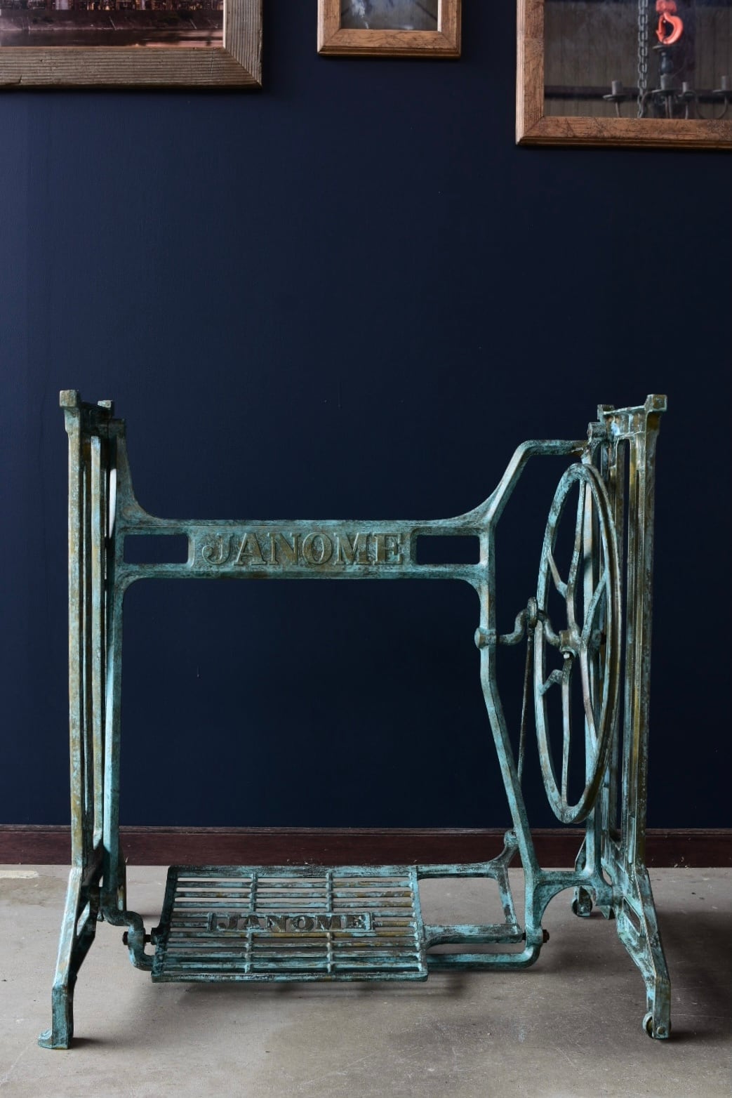 脚は、昔のアンティークミシン脚を使用し、オリジナルの緑青塗装を施しています。塗料に金属粉が含まれた高級塗料で、青錆を発生させることでこのように、銅が錆びたような、美しく、長年経過したような味わい深いビジュアルに仕上がります。